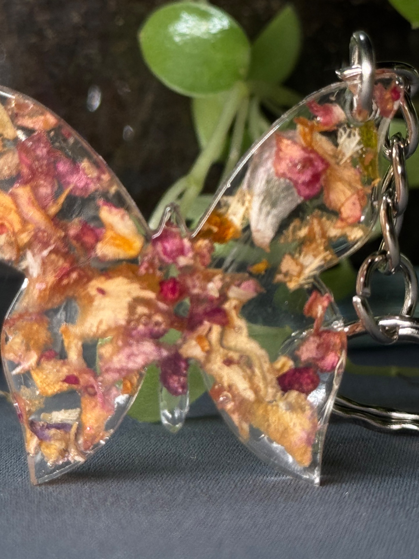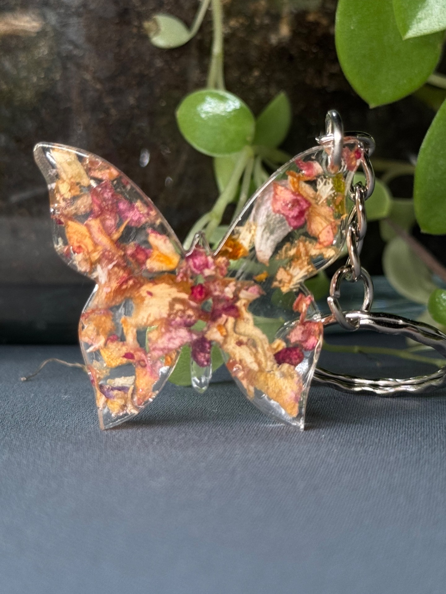 Jemný přívěsek ve tvaru motýlka, který okouzlí svou lehkostí a jemným zpracováním. Ideální jako drobná ozdoba na klíče, kabelku nebo batoh. Každý kousek je ručně vyráběný a uvnitř se skrývá dekorace v podobě třpytek, sušených květů nebo jejich kombinace. Díky tomu je každý kus naprostý originál a může se mírně lišit odstínem či rozmístěním prvků.