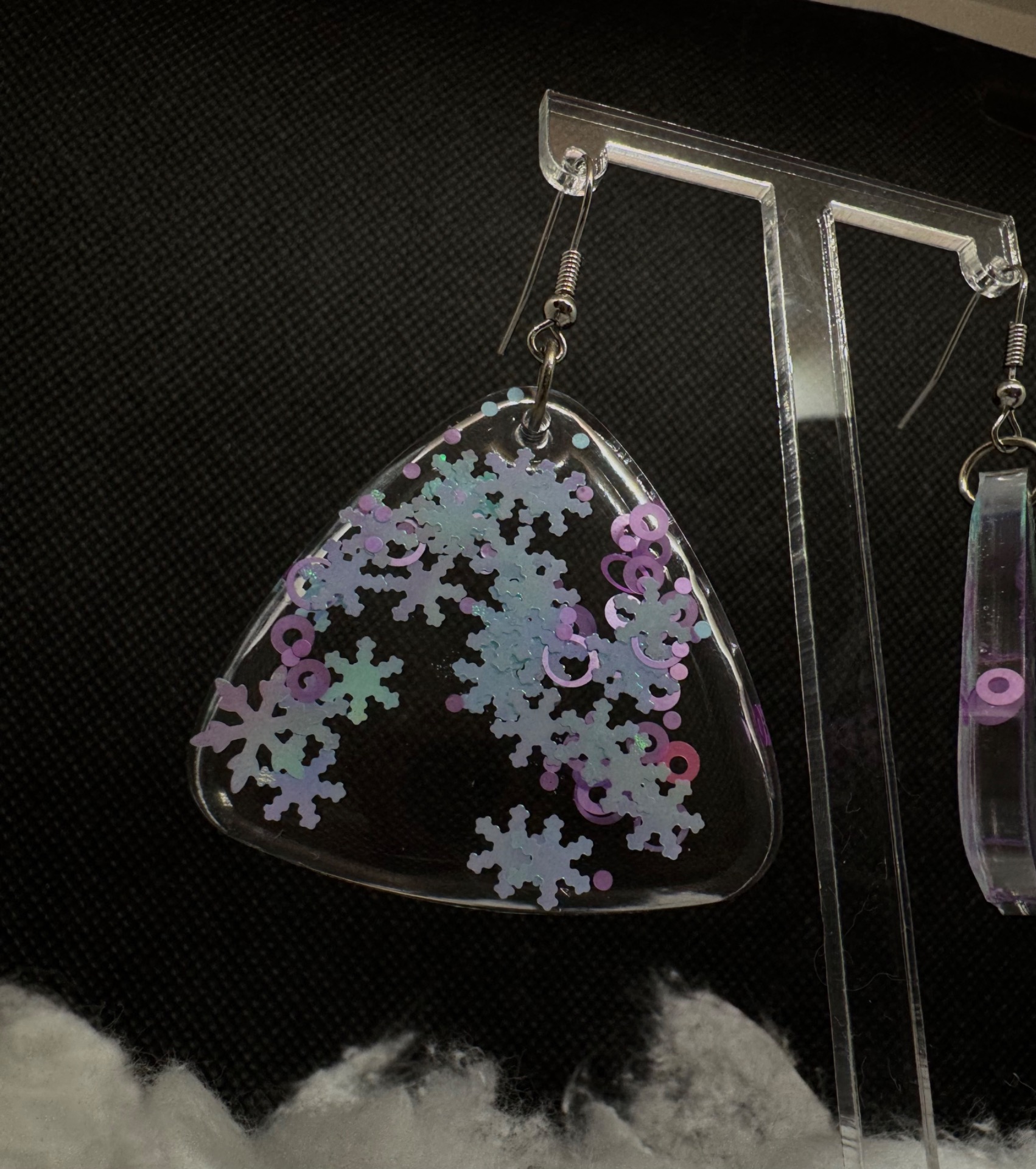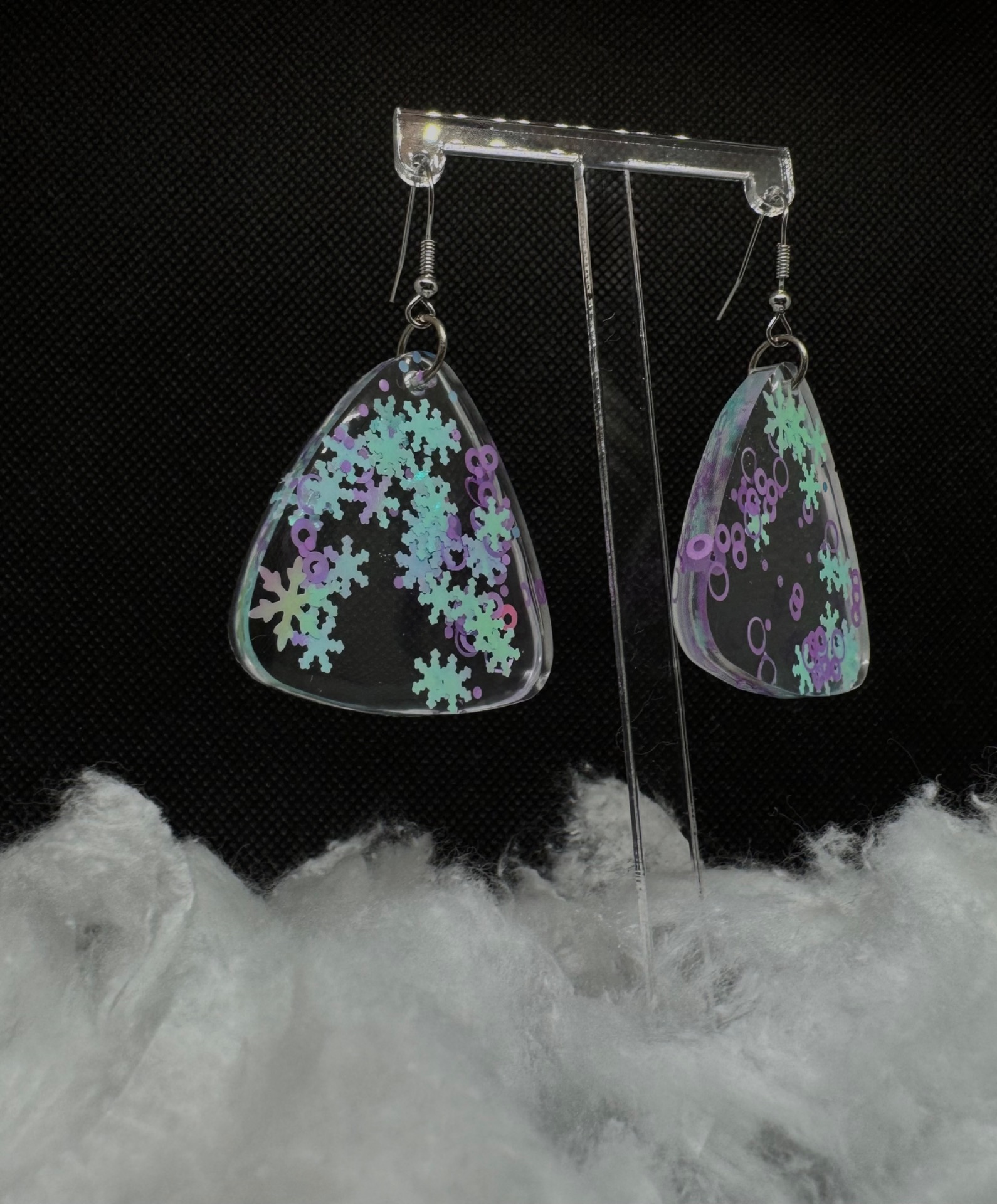 trojúhelníkové náušnice vytvořené z čiré epoxidové pryskyřice, do které jsou