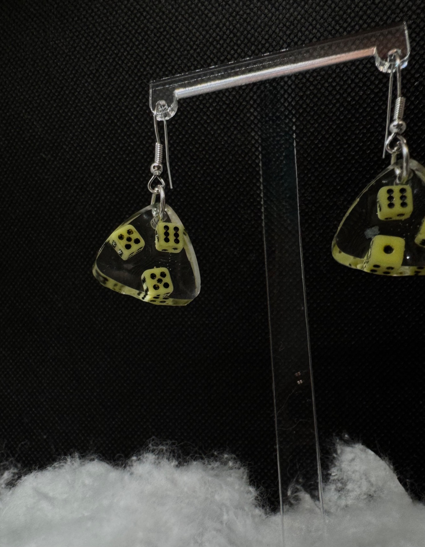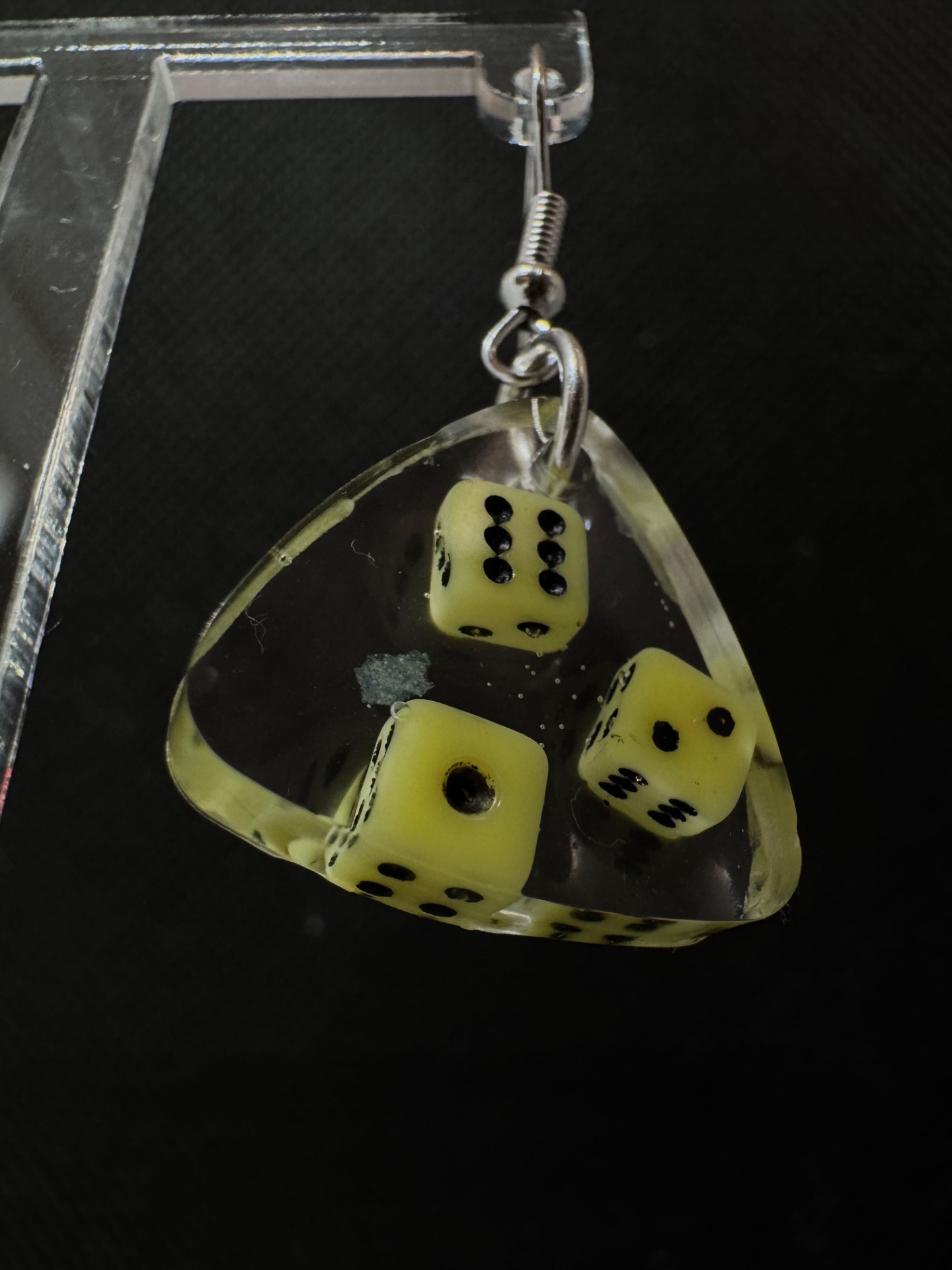 trojúhelníkové náušnice z čiré epoxidové pryskyřice, v níž se ukrývá směs