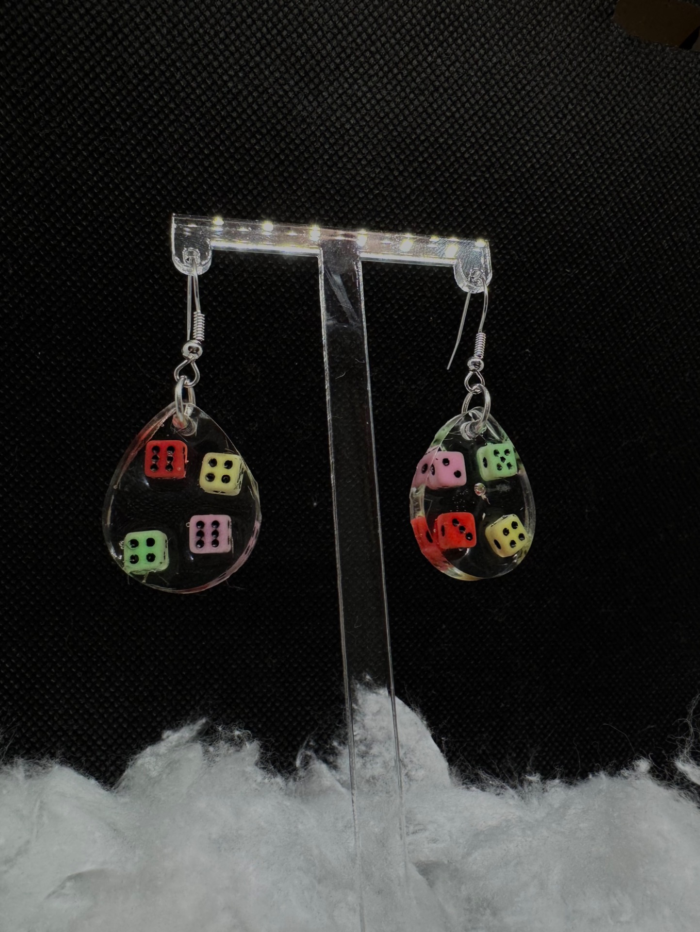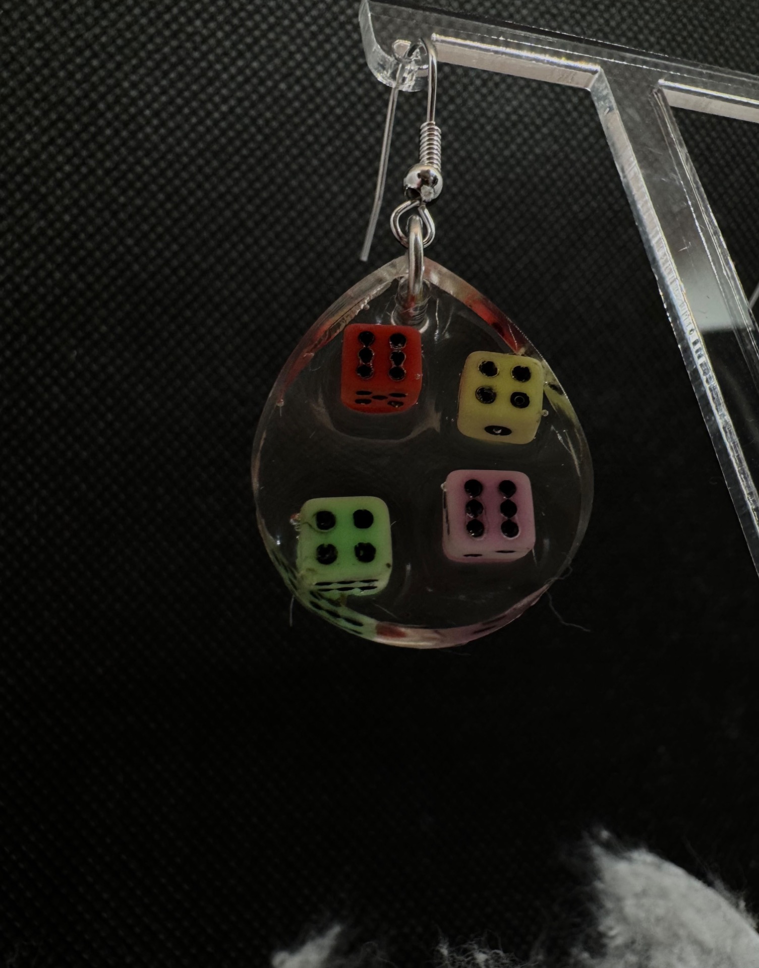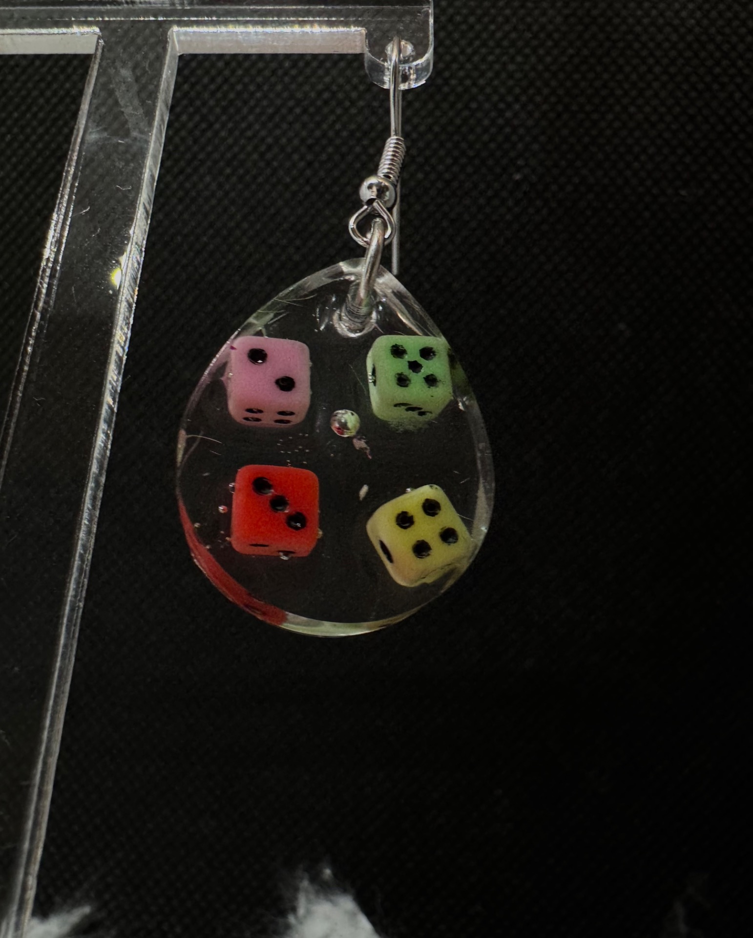 náušnice z čiré epoxidové pryskyřice ve tvaru drobné kapky. Zalité sušenými