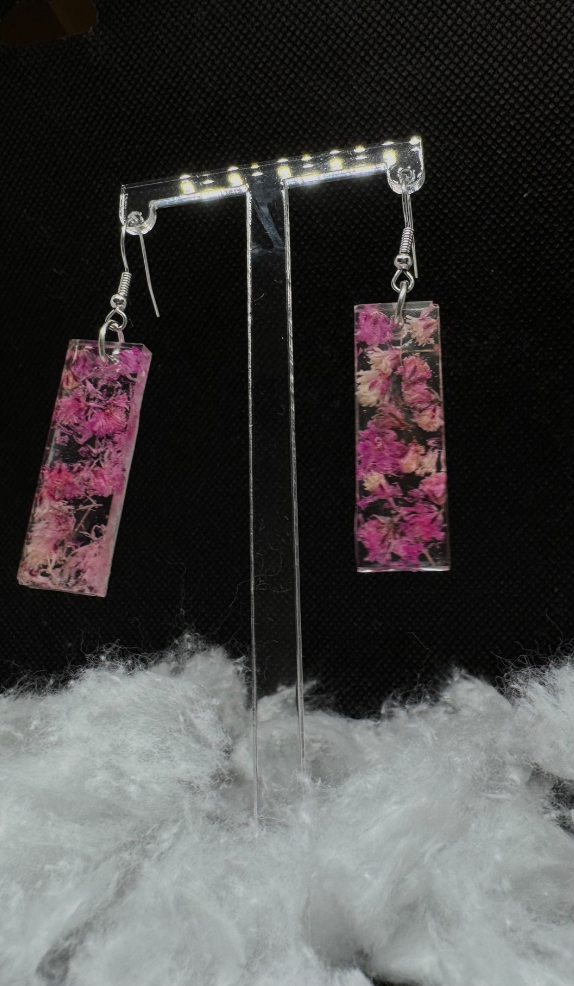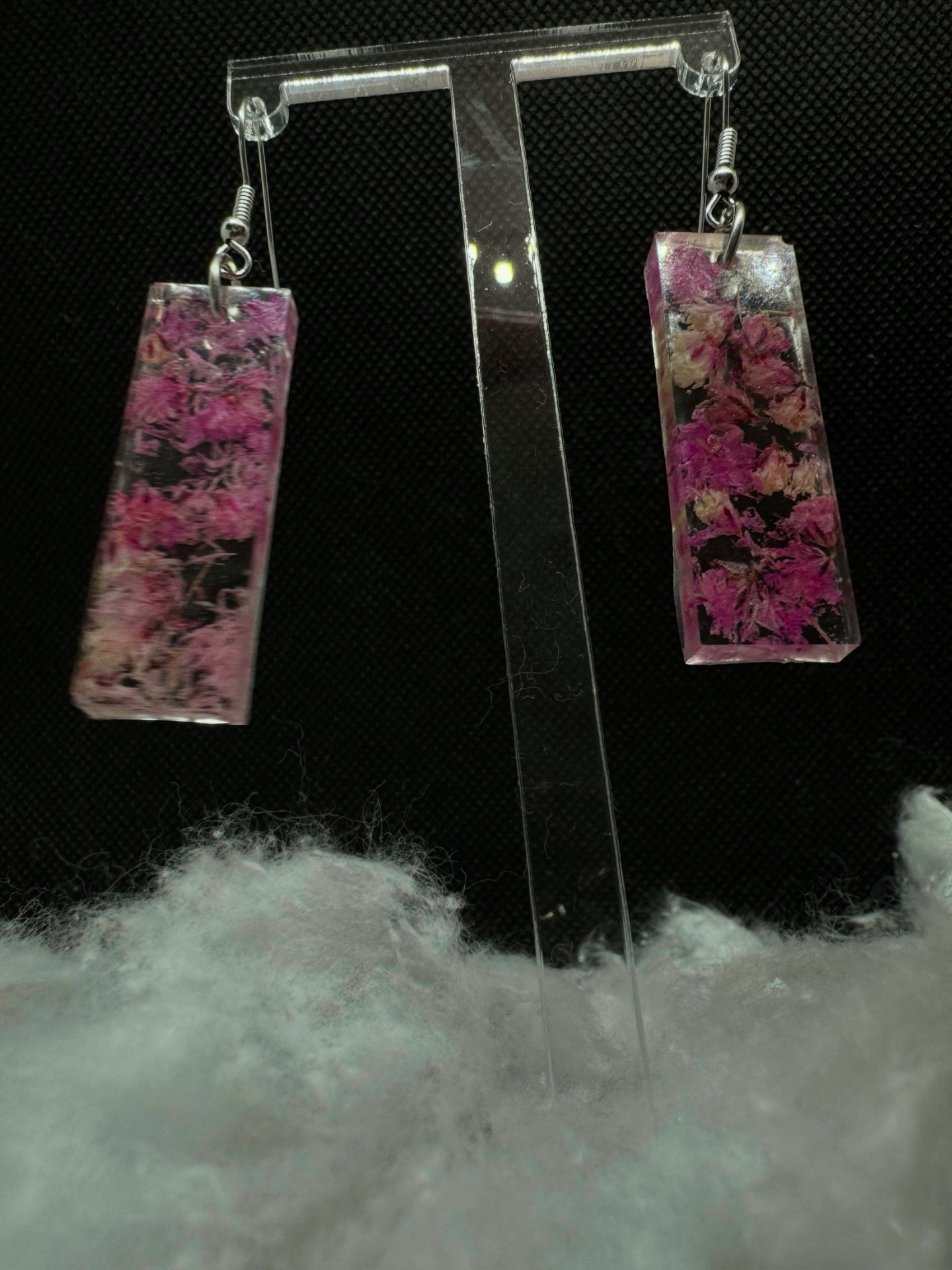 vyráběné náušnice z čiré epoxidové pryskyřice ve tvaru protáhlého obdélníku.
