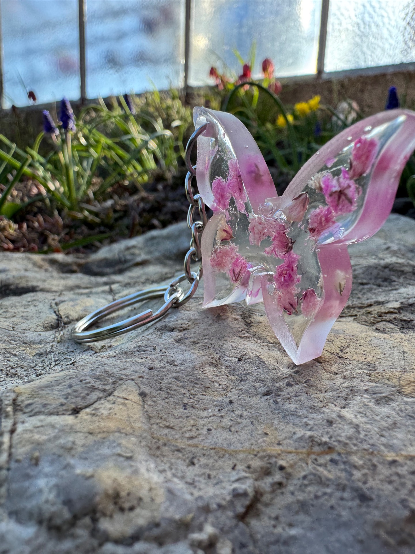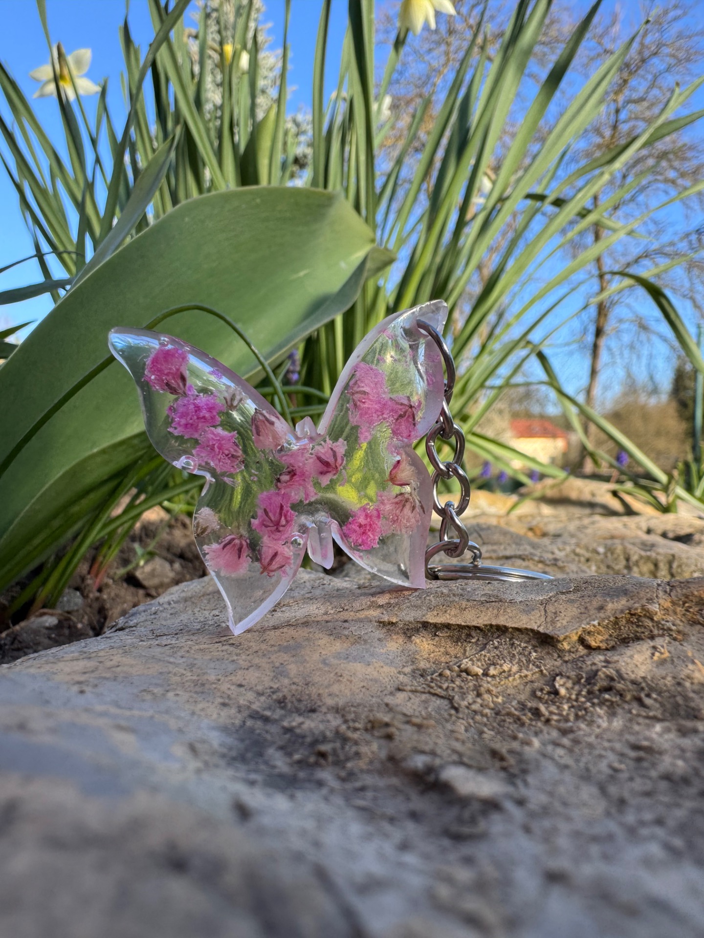 Jemný přívěsek ve tvaru motýlka, který okouzlí svou lehkostí a jemným zpracováním. Ideální jako drobná ozdoba na klíče, kabelku nebo batoh. Každý kousek je ručně vyráběný a uvnitř se skrývá dekorace v podobě třpytek, sušených květů nebo jejich kombinace. Díky tomu je každý kus naprostý originál a může se mírně lišit odstínem či rozmístěním prvků.