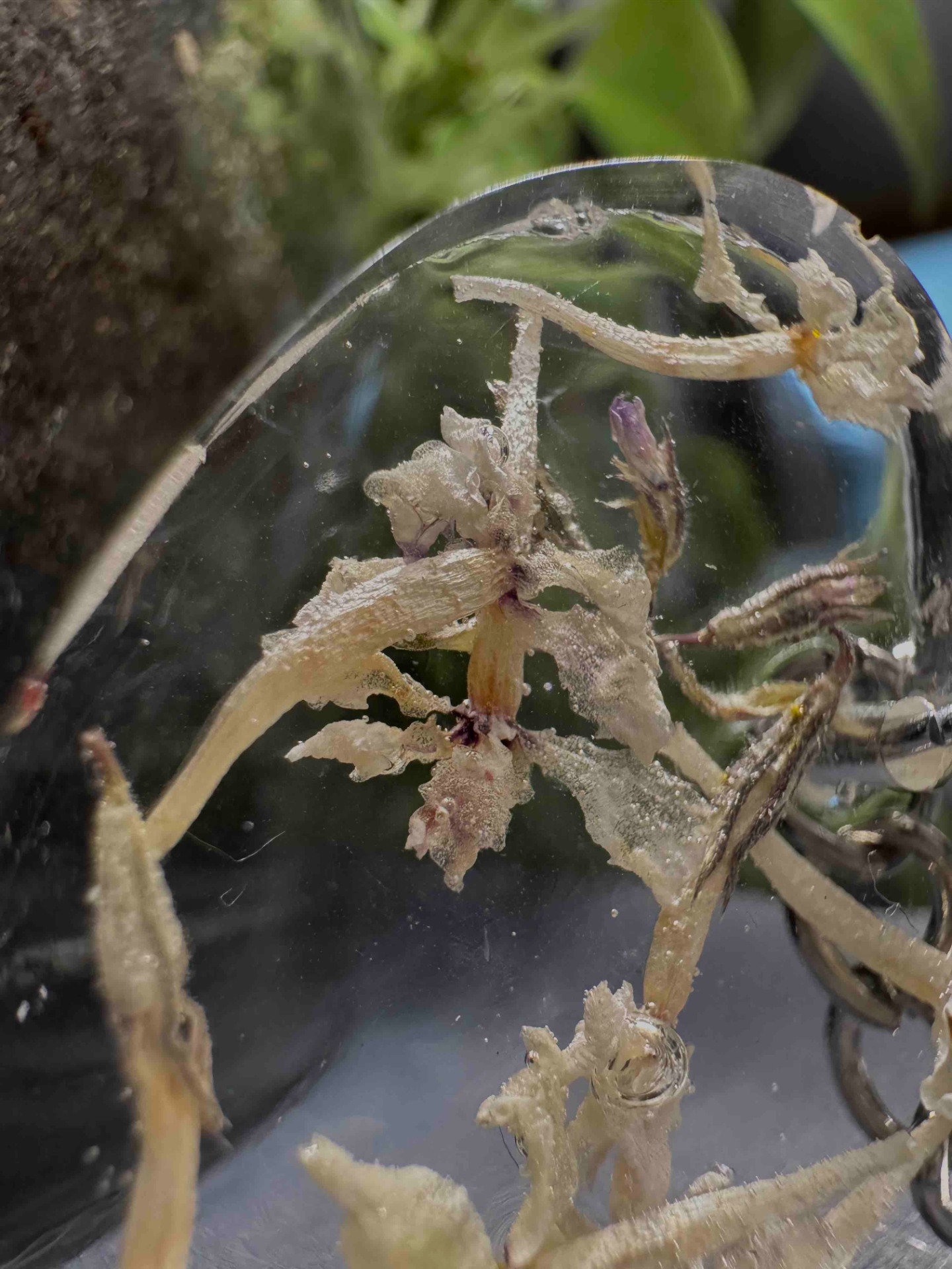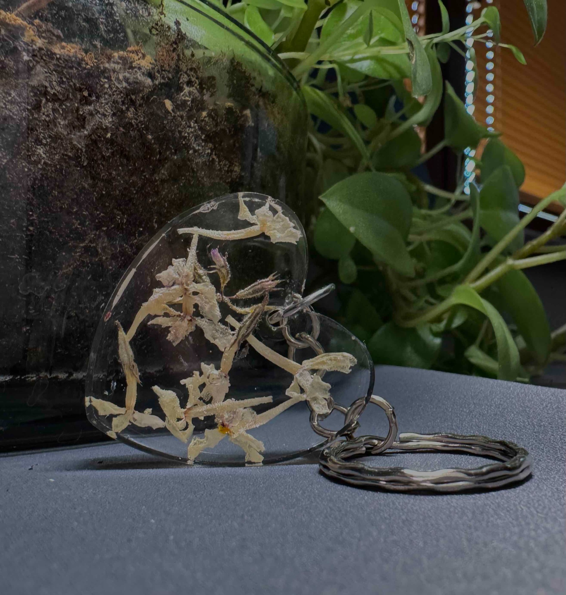 Upozornění: Přívěsek je dekorativní doplněk, není určen ke hraní. Uchovávejte mimo dosah malých dětí – obsahuje drobné části, které nejsou jedlé a mohly by představovat nebezpečí při vdechnutí nebo spolknutí. Chraňte před dlouhodobým působením vody, chemikálií a přímým slunečním zářením. Každý výrobek je originál. Fotografie jsou pouze ilustrační a skutečný vzhled produktu se může mírně lišit. Barva květiny zalité v pryskyřici se může časem změnit – jde o přirozený proces, který ovlivňuje pigmentaci rostlin a nelze jej zcela ovlivnit.